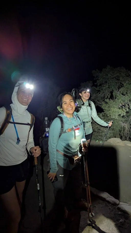 From there, it was a slow uphill walk about 7 miles to the South Kaibab Trailhead. We took a good handful of shorter breaks, and had a longer “dinner” at Tip Off at sunset. We donned our headlamps and continued up, grateful to be out of the heat. (There were a lot of ill visitors at the canyon that day — we even heard a Search and Rescue call come in during the ranger talk due to heat illness.)
