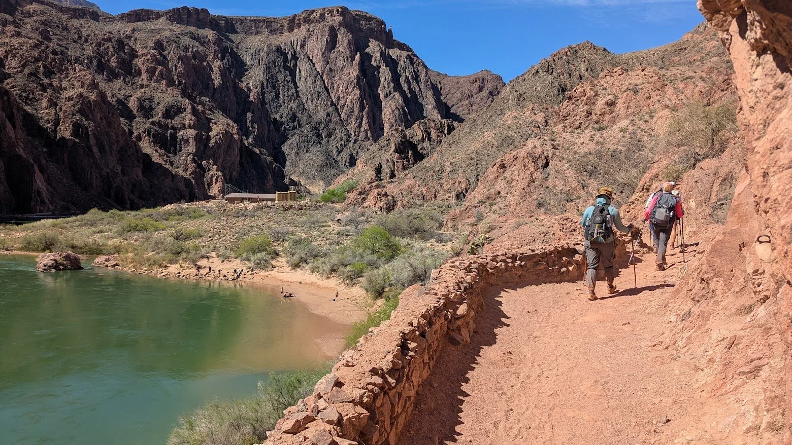 It was another (steep!) 2.5 miles to Bright Angel Creek from there. On the way down, we enjoyed the views of the Colorado River, which was especially bright blue-green due to lack of recent rain. We saw the mule train just uphill of the Black Bridge.