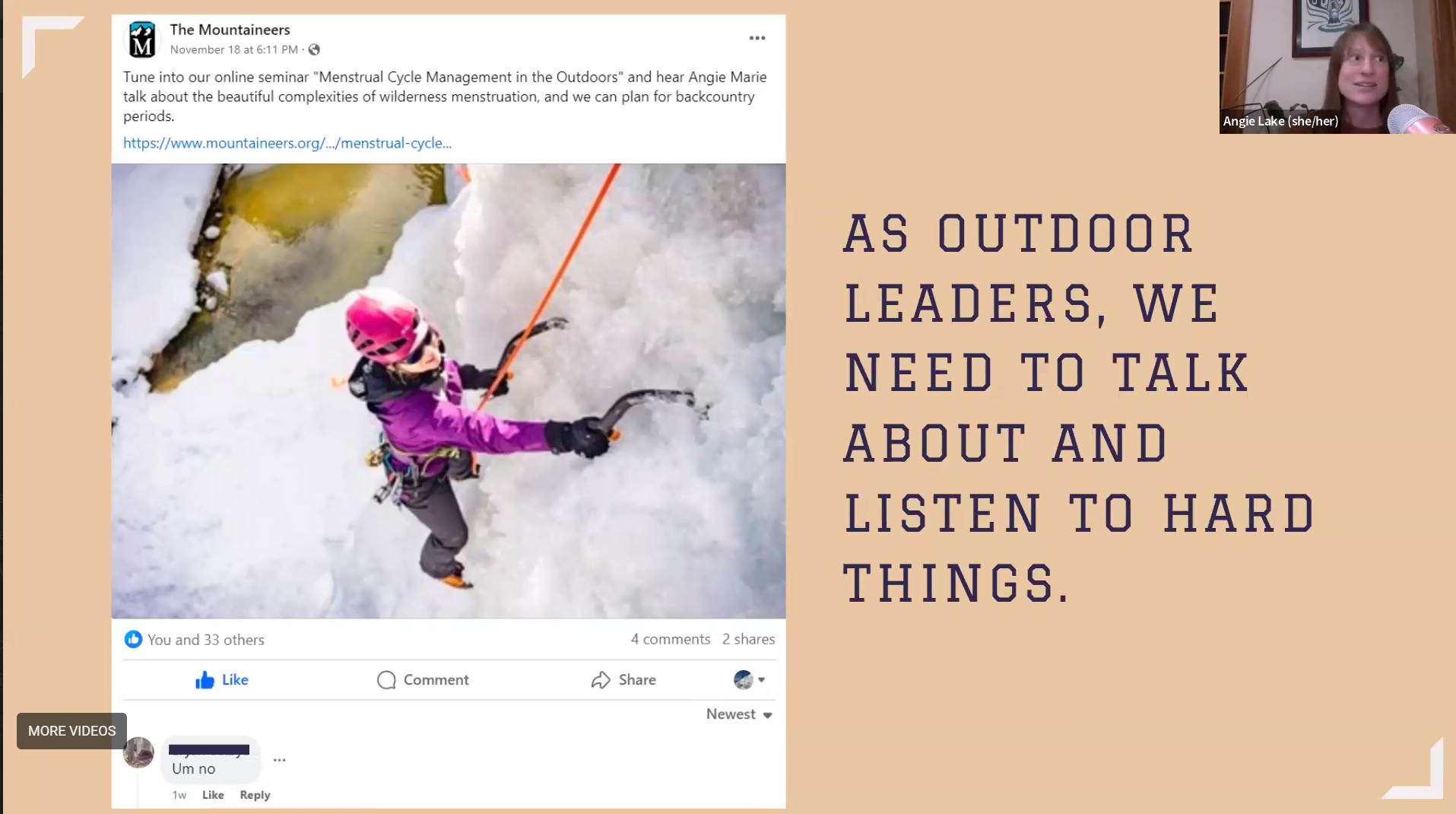 The Mountaineers Leadership Development Series: workshops on communication, equity, and menstrual health for outdoor leaders